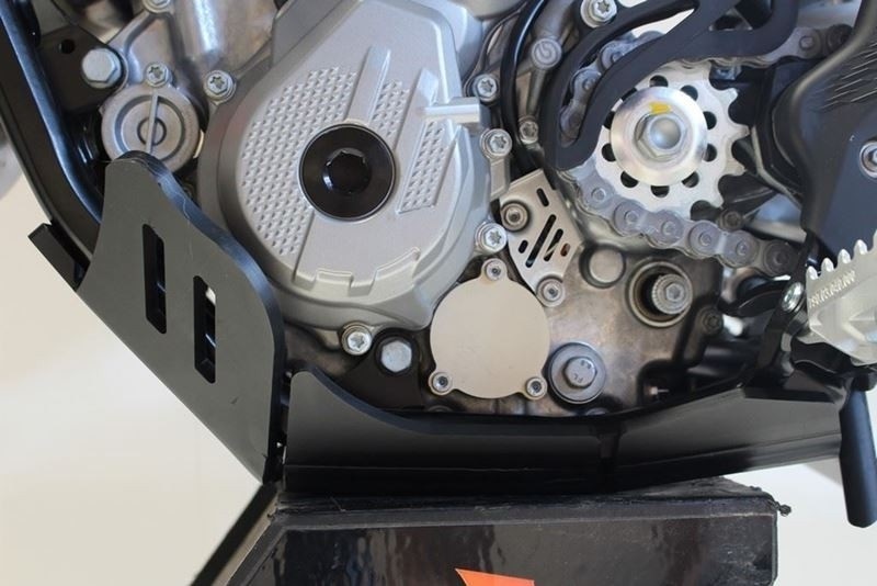 • It incorporates full frame protection to below the footpegs. It also completely envelops the water pump and protects the linkage thanks to its extra thickness (16mm in total below the linkage).