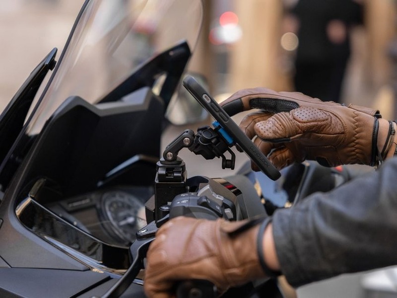 El cabezal de indexación se puede inclinar y el brazo tiene múltiples puntos de giro, lo que le permite colocar su smartphone en el ángulo de visión óptimo, sin interferir con los controles de su scooter o moto.